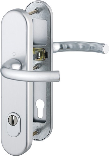 Schutzgarnitur Tôkyô 1710/3332ZA/3410 Alu.F1 92mm 66-76mm HOPPE für Abschlusstüren · geprüft nach DIN EN 1906: zertifiziert nach DIN 18257 ES1 · Unterkonstruktion: außen Stahl, innen Aluminium, Stütznocken · mit Rückholfeder-Paket · außen: gekröpfter, feststehender Knopf (ummontierbar), Zylinderabdeckung aus gehärtete