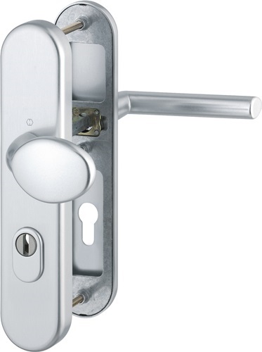 Schutzgarnitur Stock.76G/3332ZA/3410/1140 Alu.F1 72mm 36-46mm HOPPE für Abschlusstüren mit ZA · geprüft nach DIN 18257 · Unterkonstruktion: außen Stahl, innen Aluminium, Stütznocken · mit Rückholfeder-Paket · Wechselgarnituren mit gekröpftem Knopf · feststehend (ummontierbar) · Zylinderabdeckung aus gehärtetem Stahl für vorstehende Zylinderlänge 10-18 mm · mit Schnellstift-Verbindung · hochfeste, verdeckte Verschraubung · PZ · einschließlich Befestigungsmaterial M 6 · DIN links / rechts · Widerstandsklasse ES 1Weitere technische Eigenschaften:· Breite: 54mm· Länge: 250mm· Abdeckung: mit Zylinderabdeckung· Schildstärke: 15 mm