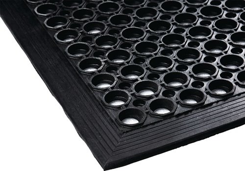 Anti-Ermüdungsmatte B.0,9m L.1,5m D.12mm schwarz NR/SBR o.Gewebeeinlage vielseitig einsetzbar für den Innen- und Außenbereich · u. a. als Fußmatte · einsetzbar am Arbeitsplatz · gelocht, Unterseite genoppt · abriebfest · witterungsbeständig · mit einem Rand an den Seiten Qualität: NR/SBR Härte: 70 +/-5° Shore A Einsatztemperatur: -10 bis +70°C Unterseite: genoppt Farbe: schwarz Weitere technische Eigenschaften: · Farbe: schwarz · Ausführung: ohne Gewebeeinlage · Material: NR/SBR