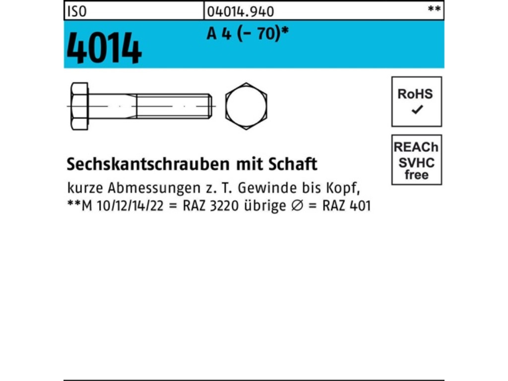 Sechskantschraube ISO 4014 Schaft M16x 260 A 4 1 Stück ISO 4014 A 4 - 70 Sechskantschrauben mit Schaft - Abmessung: M 16 x 260* VE=S (1 Stück)Weitere technische Eigenschaften:· l: 260mm· Gruppencode: 04014.940· Normart: ISO 4014