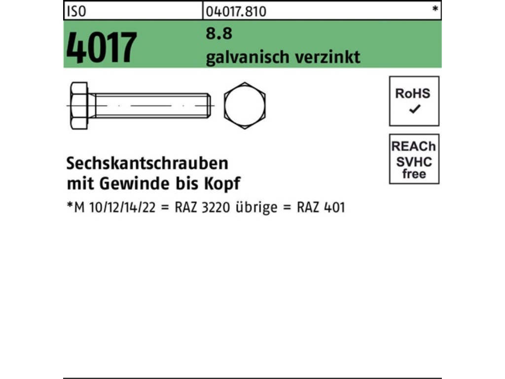 Sechskantschraube ISO 4017 VG M20x 460 8.8 galv.verz. 1 Stück ISO 4017 8.8 galvanisch verzinkt Sechskantschrauben mit Gewinde bis Kopf - Abmessung: M 20 x 460 VE=S (1 Stück)Weitere technische Eigenschaften:· l: 460mm· Gruppencode: 04017.810· Normart: ISO 4017