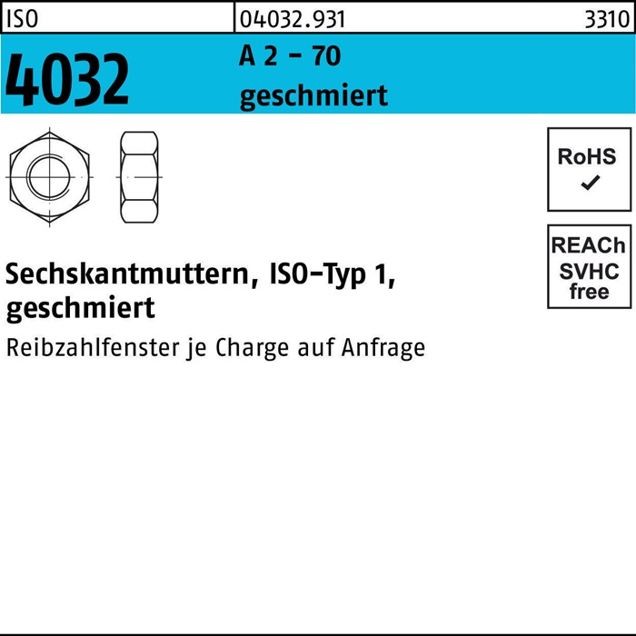 Sechskantmutter ISO 4032 M10 A 2 - 70 geschmiert 250 Stück ISO 4032 A 2 - 70 geschmiert Sechskantmuttern · ISO-Typ 1 - Abmessung: M 10 VE=S (250 Stück)Weitere technische Eigenschaften:· Gruppencode: 04032.931· Normart: ISO 4032