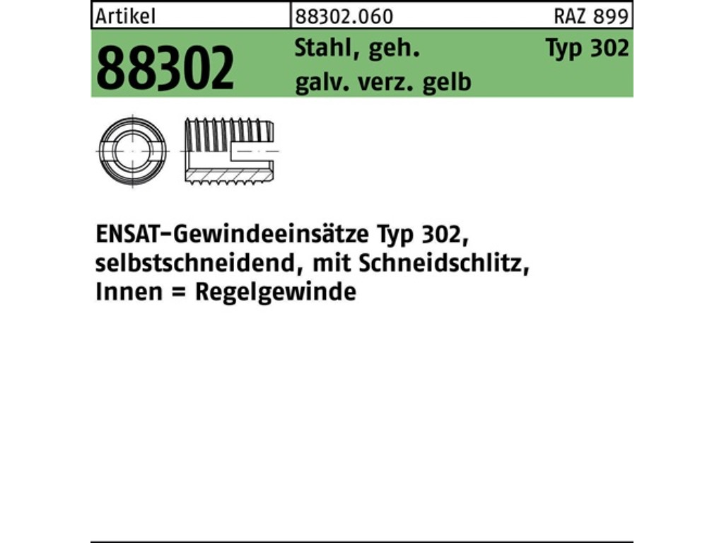 Gewindeeinsatz R 88302 Typ 302 M16x22 Stahl geh.galv.verz. gelb 10St. ENSAT Artikel 88302 Stahl · geh. Typ 302 galv. verz. gelb ENSAT-Gewindeeinsätze Typ 302 selbstschn. · Schneidschlitz · Regelgew. - Abmessung: M 16 x 22 VE=S (10 Stück)Weitere technische Eigenschaften:· Typ: Typ 302· Material: Stahl, geh.· Norm: REYHER-Artikel 88302· Gruppencode: 88302.060· Normart: REYHER-Artikel 88302· Oberfläche: galv. verz. gelb· Produkt-Typbezeichnung: ENSAT-Gewindeeinsätze Typ 302, selbstschneidend, mit Schneidschlitz, Innen = Regelgewinde