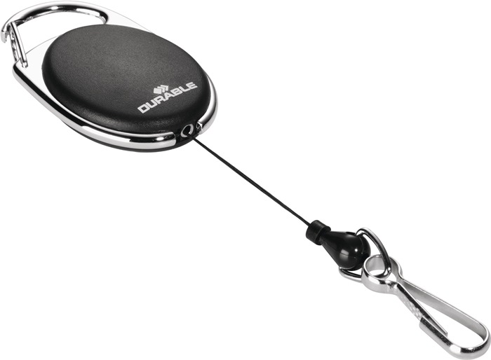 Ausweishalter m.Federhaken Band-L.800mm schwarz DURABLE mit Federhaken · Aufrollmechanismus Länge 800 mm · zur Befestigung von Namensschilder, Ausweishalter, Schlüssel etc. · mit Metallclip-Befestigung