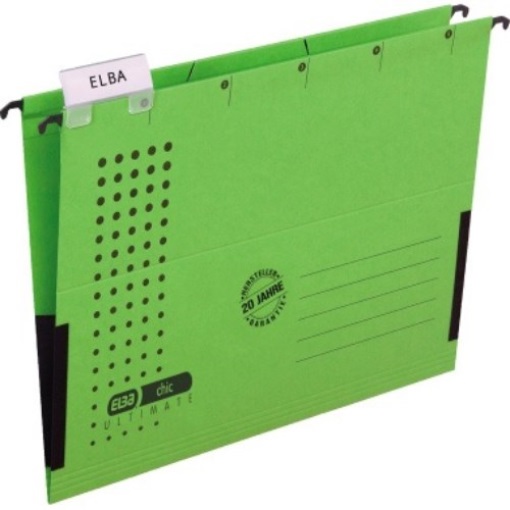 ELBA 100552104 ELBA Hängetasche chic® ULTIMATE® DIN A4 240g/m² Karton grün Exklusiver · starker Karton verhindert das Ausreißen des Kartons bei intensivem Gebrauch. Komfortsichtreiter mit aufklappbarer Rückwand und auswechselbarem Beschriftungsschildchen. Schlitzstanzung für Einhängeheftstreifen 100551905. Extrem steife Metallhängeschienen mit pulverbeschichteten Enden.