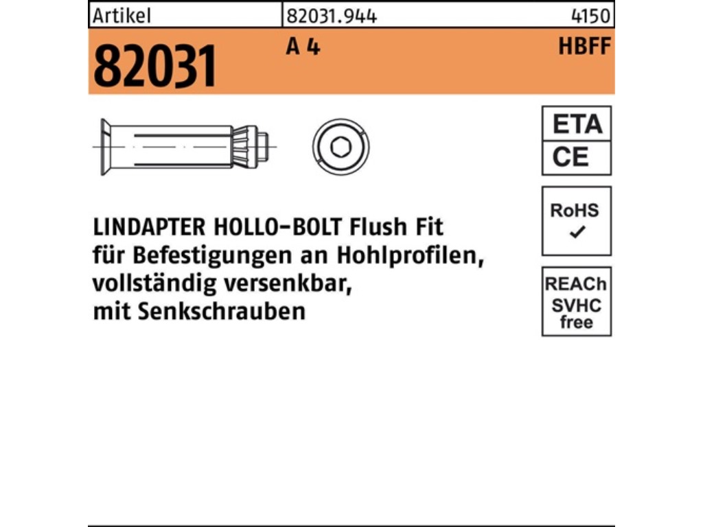 Hohlraumdübel R 82031 HBFF 08-1 ( 50/27) A 4 1 Stück Artikel 82031 A 4 HBFF LINDAPTER-HOLLO-BOLT FlushFit f. vollst. versenkbare Befestigung an Hohlprofilen - Abmessung: HBFF 08-1 ( 50/27) VE=S (1 Stück)Weitere technische Eigenschaften:· Material: A 4· Gruppencode: 82031.944· Länge: 1mm· Normart: REYHER-Artikel 82031· Oberfläche: Ohne Oberflächenangabe