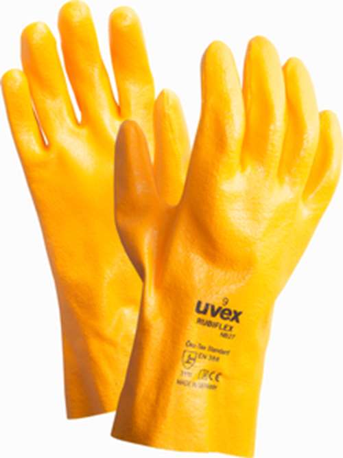 Für die harten Einsätze in feuchten, öligen oder fettigen Arbeitsumgebungen: Der uvex rubiflex NB27 beweist auch bei anspruchsvollen Aufgaben, dass sich Schutz und Fingerspitzengefühl wunderbar verbinden lassen.Allgemeine Merkmale vollbeschichteter Baumwoll-Interlock-Schutzhandschuh für mechanische Tätigkeite vollbeschichtet mit NBR-Spezial-Beschichtung (Nitril-Kautschuk) Stulpenlänge: ca. 27 cm Farbe: orange erhältlich in den Größen: 7 bis 11Schutz-Merkmale zertifiziert nach EN 388:2016 (3 1 1 1) sehr gute mechanische Abriebfestigkeit der NBR-BeschichtungKomfort-Merkmale gutes Tast- und Fingerspitzengefühl ergonomische Passform schadstofffrei nach OEKO-TEX® Standard 100Einsatzgebiete Kontrollarbeiten Instandhaltung Wartungsarbeiten leichte bis mittlere Metallarbeiten Lackierarbeiten