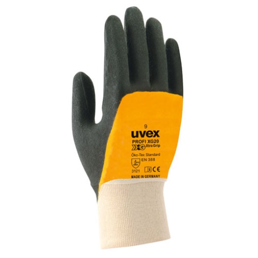 Die uvex profi ergo XG Schutzhandschuh-Serie ist mit einer innovativen Xtra-Grip-Beschichtung aus Nitril-Kautschuk ausgestattet. Sie verbindet Schutz und Griffsicherheit mit hervorragendem Tragekomfort und Flexibilität. Der mehrlagige Aufbau ermöglicht dabei hervorragende Standzeiten.Allgemeine Merkmale Schutzhandschuh mit uvex Xtra Grip Technology Innenhand und gesamter Handrücken mit NBR-Spezial- und Xtra-Grip-Beschichtung (Nitril-Kautschuk) Farbe: weiß, orange, schwarz erhältlich in den Größen: 7 bis 10Schutz-Merkmale zertifiziert nach EN 388 (3 1 2 1) sehr gute mechanische Abriebfestigkeit durch den Multilayer-Aufbau für erhöhte Standzeit hervorragende Griffsicherheit in feuchten, nassen und öligen Bereichen Komfort-Merkmale gutes Tast- und Fingerspitzengefühl ergonomische Passform hohe Flexibilität sehr guter Tragekomfort durch die hohe Wasserdampfaufnahme des Baumwollfutters schadstofffrei nach OEKO-TEX® Standard 100Einsatzgebietemechanischer Schutz für Heavy-Duty-Einsätze im Bereich: Montage Kontrollarbeiten Instandhaltung leichte bis mittlere Metallarbeiten Beton- und Bauarbeiten Outdoortätigkeiten