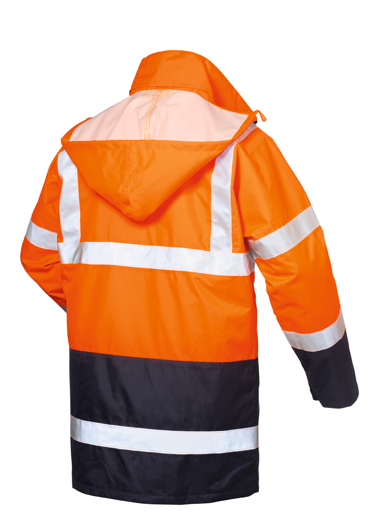 ORANGE/MARINENorm EN ISO 20 471, Klasse 3 (Innenjacke separat Klasse 2, Innenweste separat Klasse 2), EN 343 Klasse 3, EN 14058 Klasse 1, EN 340Obermaterial 100% Polyester, mit atmungsaktive PU-BeschichtungAtmungsaktivität 2.000 g/m²/24 hWassersäule 2.000 mmGrößen S-XXXXLWattierung 100% PolyesterFutter 100% Polyester