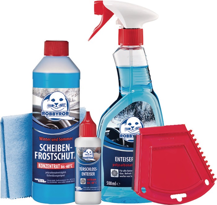 ROBBYROB 8750000000 Winterset 5-teilig Inhalt jeweils 1 Stück: Klarsichttuch, Eiskratzer, Türschloss-Enteiser 50 ml, Frostschutz für die Scheibenwaschanlage bis -60 °C 500 ml, Scheibenenteiser 500 ml