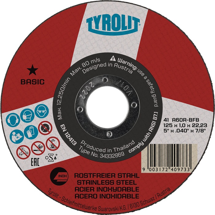 TYROLIT 34332868 Trennscheibe A60R-BFP Basic D115x1mm gerade INOX Bohrung 22,23