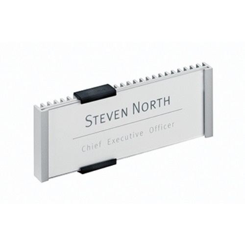 DURABLE Türschild INFO SIGN 480023 149x52,5mm metallic silber Türschild in Rippenoptik mit 2 versetzten · schwarzen Befestigungskappen. Nicht spiegelnde Acrylplatte schützt die Kartoneinlage. An gewünschtem Objekt mit beiliegendem Montageset verschrauben oder verkleben.
