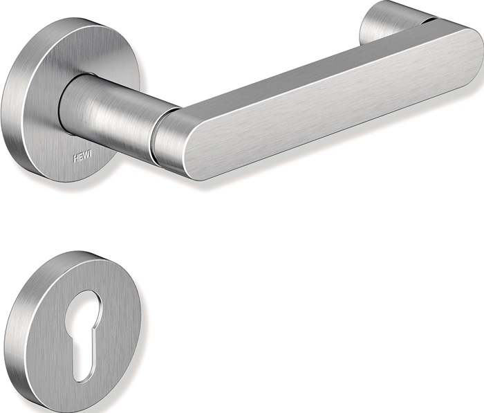Rosettengrt.270XAH01.230 VA U-Form PZ DIN L/R D/D HEWI in H-Technik mit Rosetten nach DIN 18255 und DIN EN 1906 aus Edelstahl, Oberfläche matt geschliffen, bestehend aus: Türdrücker Modell 272X... in U-Form aus Edelstahl (1.4301), Ansatz-Durchmesser 21,3 mm, mit Ansatzführung und Rastnut, mit Gewindestift M5