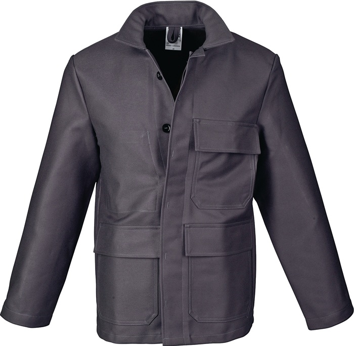 Schweißerschutz-Jacke Gr.52 grau PROBAN EN ISO 11611:2015 Klasse 2 A1 A2, EN ISO 11612:2015 A1 A2 B1 C1 · 100% Baumwolle, Proban ® -Ausrüstung · ca. 470 g/m² · eine Brustinnentasche rechts · eine Brustaußentasche links mit Patte und verdecktem Knopf · zwei Seitentaschen mit Patte und verdecktem