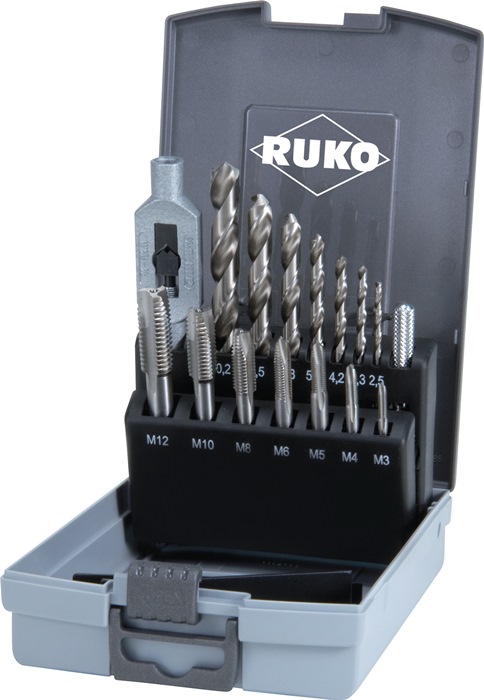 Gewindebohrersatz Form B ca.4-5 Gänge m.Schälanschnitt metrisch HSS RUKO HSS · DIN 352 · metrisches ISO-Gewinde · für Durchgangsgewinde · für unlegierte und niedriglegierte Stähle bis 800 N/mm² · das Gewinde kann von Hand und im Maschinengebrauch in einem Arbeitsgang geschnitten werdenbestehend aus:je 1 EinschnittgewindebohrerM3, M4, M5, M6, M8, M10 und M12je 1 KernlochspiralbohrerDIN 338 Typ N HSS-G Ø 2,5/ 3,3/ 4,2/ 5,0/ 6,8/ 8,5/ 10,2 mm1 verstellbares Windeisen DIN 1814 Gr. 1 1/2Weitere technische Eigenschaften:· Hauptanwendung: Stahl · Verpackungseinheit: 1