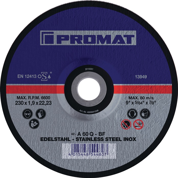 Trennscheibe INOX D115x1,5mm ger.INOX Bohr.22,23mm PROMAT hohe Standzeit · hohe Schnittgeschwindigkeit · vibrationsarm · geringe Staubentwicklung · kühler Schnitt · nahezu gratfreier Schnitt · zur Bearbeitung von rostfreien Stählen, Blechen und dünnwandigen Profilen · Bohrung 22,23 mm Ø