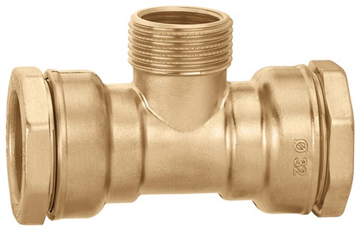Caleffi T-Stück 865 Messing 20x1/2Zoll AGx3/8Zoll IG für PE-Kunststoffrohre · max. Betriebsdruck: 16 bar · max. Betriebstemperatur: 40 °C