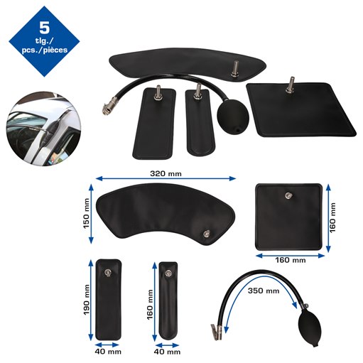 Brilliant Tools BT516010 Druckkissen-Satz, 4-tlg.5-teiliger Satzzum beschädigungsfreien Spreizen von z.B. Türrahmen für NotfallöffnungHandpumpe mit VentilDer BRILLIANT TOOLS Druckkissen-Satz BT516010 ist ideal für Fahrzeugöffnungen ohne Beschädigungen. Extrem flach (nur 1,2 mm!) und robust. Schnelles und leichtes Wegdrücken der Fahrzeugtür/Seitenscheibe um einen Arbeitsspalt zu schaffen. Auch geeignet für leichte Karosseriearbeiten und Demontage von z.B. Zierleisten, Stoßfängern und bei Montagearbeiten von z.B. Fenstern oder Türen.Lieferumfang:1 x Kissen Nierenform Abmessungen: 32 x 15 cm1 x Kissen 19 cm x 60 mm1 x Kissen 16 cm x 40 mm1 x Kissen 16 x 16 cm1 x Handpumpe mit Schlauchlänge 35 cm