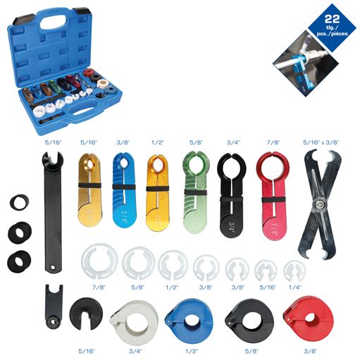 Brilliant Tools BT531050 Leitungs-Entriegelungs-Werkzeug-Satz, 22-tlg.22-teiliger Satzfür schwer zu öffnenden Leitungskupplungen bei Klimaanlagen, Kraftstoff-, Luft- und ÖlleitungenDer BRILLIANT TOOLS Leitungs-Entriegelungs-Werkzeug-Satz BT531050 eignet sich für viele schwer zu öffnenden Leitungskupplungen bei Klimaanlagen, Kraftstoff-, Luft- und Ölleitungen. Der 2-in-1 Spring-Lock Öffner kann auch problemlos ein Spring-Lock Verbinder lösen. Die Leitungsverbinder Löseclips sind zur Verwendung für Schnellverschluss-Kupplungen an Klimaanlagen und Kraftstoffleitungen. Die Lieferung des Satzes erfolgt in einem Kunststoffkoffer.Lieferumfang:1 x Spring-Lock Öffner aus Kunststoff6 er (3/8"), rot8 er (1/2"), blau10 er (5/8"), schwarz12 er (3/4"), weiss2 in 1 Spring-Lock Öffner (Kreuz)7 x Leitungsverbinder Löseclips für Schnellverschluss-Kupplungen an Klimaanlagen und Kraftstoffleitungen für Leitungsdurchmesser: 1/4", 5/16", 3/8", 1/2", 5/8", 3/4", 7/8"6 x Demontagewerkzeug aus Metall in den Größen: 5/16", 3/8", 1/2", 5/8", 3/4", 7/8"