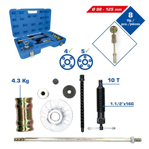 Brilliant Tools BT671200 Hydraulischer Ausdrücker-Satz für Antriebswellen, 8-tlg.8-teiliger Satzideal geeignet zum Auspressen von verrosteten oder geklebten Antriebswellenfür alle PKW mit 3-, 4- und 5-Loch Nabefür Lochkreisdurchmesser von 90 mm bis 13 cmoptimal zur Demontage von Radnaben, Bremstrommeln oder Steckachsenmit 10 Tonnen Hydraulikspindelkeine Beschädigung der Antriebswelle oder anderer BauteileDer BRILLIANT TOOLS Hydraulischer Ausdrücker-Satz für Antriebswellen BT671200 ist ein Muss für Profis in der Garage oder Werkstatt. Dank seiner überragenden Qualität und umfassender Ausstattung er ideal für den professionellen Einsatz. Der Satz ist ideal geeignet zum Auspressen von verrosteten oder geklebten Antriebswellen. Mit Hilfe des Schlaggewichtes kann der Satz auch zur Demontage von Radnaben, Bremstrommeln oder Steckachsen genutzt werden.