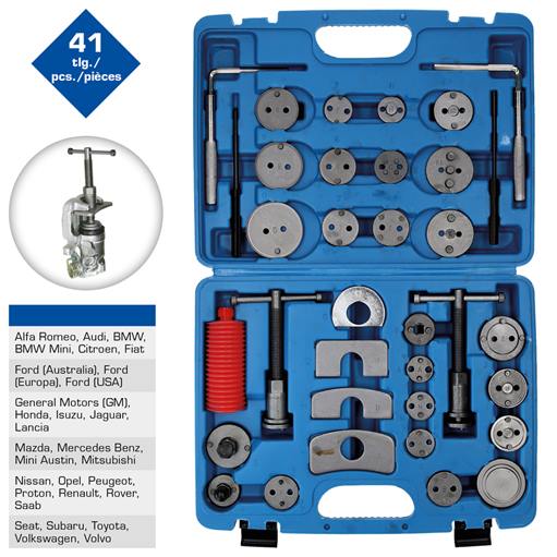 Brilliant Tools BT701050 Universal-Bremskolben-Rückstellwerkzeug-Satz, 41-tlg.41-teiliger Satzzum Rückstellen der Bremskolben aller gängigen Automarkeninklusive links und rechtsdrehender SpindelDer BRILLIANT TOOLS Universal-Bremskolben-Rückstellwerkzeug-Satz BT701050 ist ein umfangreiches Sortiment zum Rückstellen der Bremskolben aller gängigen Automarken. Die beiliegenden links und rechtsdrehenden Spindel Bremskolbenrücksteller drücken schonend und gleichmäßig die Kolben zurück. Dadurch werden keine Beschädigungen an Dichtungen oder sonstigem durch ungleichmäßigen Druck verursacht.Lieferumfang:O = Rückhalteplatte0 = Rückhalteplatte11 = Rückhalteplatte12 = Rückhalteplatte0 = General Motors2 = CitroënXM, Xantia und andere3 = Alfa Romeo, Audi, Austin, BMW, Ford, Honda, Jaguar, Mercedes-Benz, Mitsubishi, Nissan, Rover, Toyota, VW4 = Alfa Romeo 164 2.0, Ford, Mazda, Saab 9000, Subaru5 = Adapter Innenvierkant mit 3/8"6 = Nissan Primera, VW-Golf IV7 = Audi 80;90; V8 + 100, Ford Sierra ABS + Scorpio ab 1985, Honda Prelude, Nissan Silvia 1.8 turbo, Rover 8000, Saab 9000, Subaru L+Z, VW Golf + Passat8 = General Motors9 = General MotorsA = RenaultB = Ford, Lincoln, SubaruC = Mini, Nissan, Opel, ToyotaD = Renault, CitroënE = NissanF = Opel, FiatG = PeugeotJ = Alfa Romeo, Audi, Fiat, Ford, Honda, Jaguar, Lancia, Nissan, Peugeot, Renault, Rover, Saab, Seat, Subaru, Volvo, VWK = CitroënC5K1 = CitroënK2 = CitroënM = Ford, Mini, NissanN = Alfa Romeo, Audi, Ford, Honda, Saab, VWP = Audi, BMW, Citroen, Ford, Lancia, Proton, Renault, Rover, VWZ = Ford, Mazda, Mitsubishi, Toyota