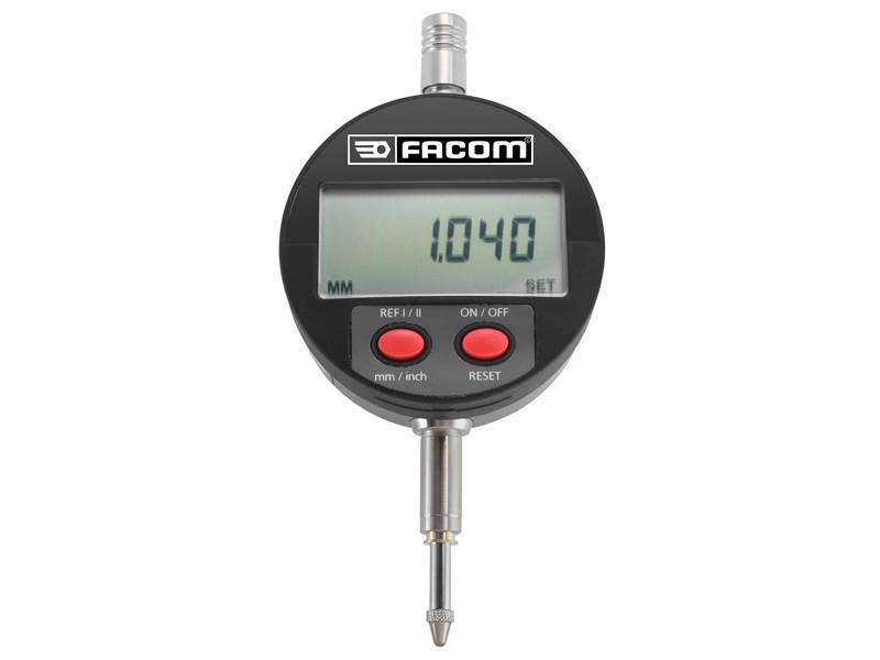Facom 1365 Schieblehre Messuhr mit Digitalanzeige 0 - 12,5 mm Produktstärken: Genauigkeit: 0,001 mm Messbereich: 0 - 12,5 mm mm/Zoll-Umschaltung Schutzklasse IP 51 LCD-Anzeige, 6 mm Einspannschaft (Ø 8 mm) Auswechselbarer Messtaster (M2,5) Um 270° drehbare Anzeige Nullpunktsetzung an beliebiger Stelle Nullpunktwechsel für jede beliebige Stellung des Messtasters Messung mit zwei verschiedenen Bezugspunkten möglich Speichern des Messwertes (Einfrieren der Anzeige) Kompatibel mit der Software Gagewedge, RS232-Ausgang Lieferung mit FACOM-Konformitätsbescheinigung