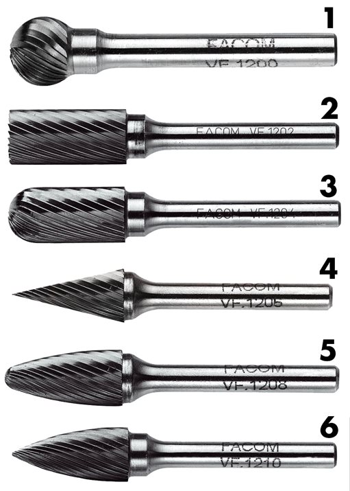 Facom VFA.1208 Hartmetallfraeser 12 mm kegelfoermig Hartmetallfräser (Nr. 5) Spiralnut rechtsdrehend Ø 12 mm kegelförmig, konvex, abgerundet 20.000 U/min Produktstärken: Fräser aus Wolframkarbid Spiralnut rechtsdrehend Schaftdurchmesser der Hartmetallfräser: 6 mm