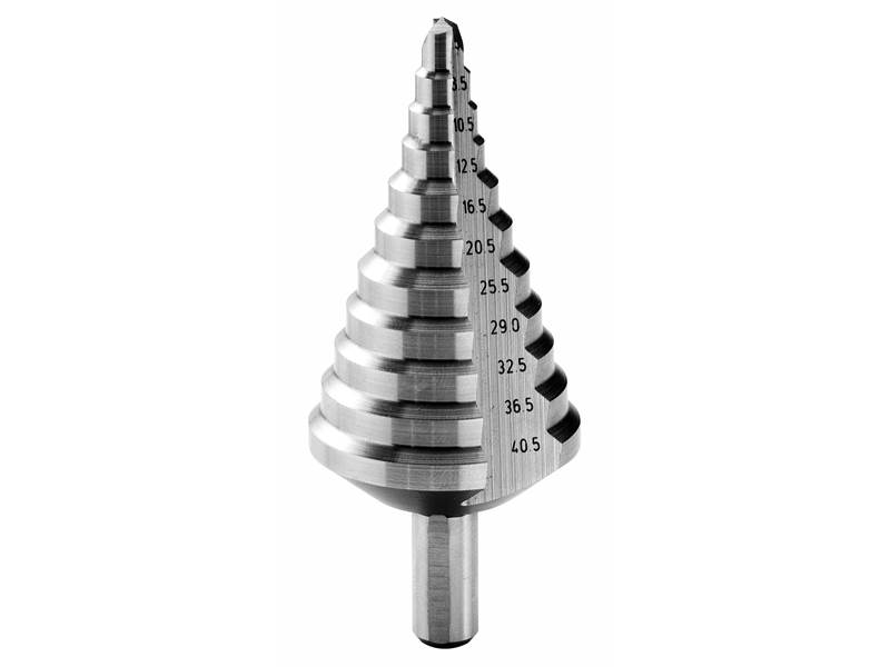 Facom 678006 ISO-Stufenbohrer 6,5 - 40,5mm 11 Stufen ISO-Stufenbohrer 11 Stufen Ø 6,5 - 40,5 mm Produktstärken: Zum genauen, zylindrischen Bohren in alle Werkstoffe Vorbohren nicht erforderlich Kreuzschliff: selbstzentrierend geringer Kraftaufwand für den Anwender, keine Gratbildung Besserer Spanauswurf Vibrationsärmer, leiser Zylinderschaft mit 3 Flanken für sicheren, gleichmäßigen Antrieb Lasermarkierung in einer Nut zur Kennzeichnung der verschiedenen Durchmesser 0