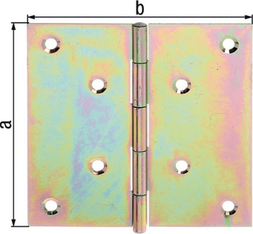 Scharnier H.60mm B.60mm S.1,5mm VA quad.GAH Ausführung: quadratisch, Gewerbeeinteilung bis 40 mm = dreiteilig, ab 50 mm = fünfteilig · mit vernietetem Edelstahlstift · Aufgrund von Umstellungen der Oberfläche kann dieser Artikel in unterschiedlichen Ausführungen (gelb-verzinkt, sendzimirverzinkt oder verzinkt-dickschicktpassiviert) geliefert werden.Weitere technische Eigenschaften:· Maß a: 60mm· Maß b: 60mm