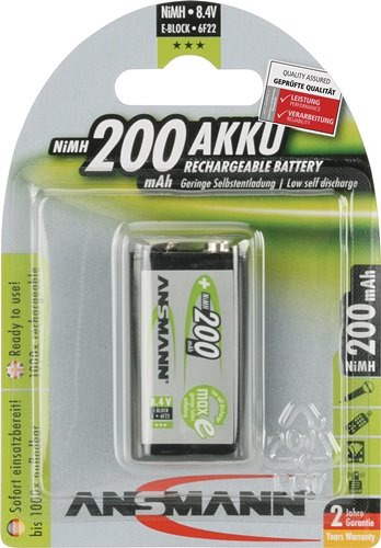 Akkuzelle maxE 8,4 V 200 mAh 9V E-Block HR9V 1 1St./Blister ANSMANN Nickel-Metallhydrid (NiMH) · vereint in sich die Vorteile von Akkus und Batterien · dank neuster Technologie besitzen die maxE Zellen im Gegensatz zu herkömmlichen Akkus eine sehr geringe Selbstentladung Besondere Produktvorteile: · sind bereits vorgeladen und sofort einsatzbereit · die geladene Zelle ist über 1 Jahr lagerfähig und sofort einsatzbereit · maxE kann wie eine herkömmliche NiMH-Zelle geladen werden · kein spezielles Ladegerät erforderlich Weitere technische Eigenschaften: · St. je Blister: 1 · IEC: HR9V · Äquivalenz: 9V E-Block Hinweis zur Entsorgung von Batterien und Akkus Da wir Batterien und Akkus bzw. solche Geräte verkaufen, die Batterien und Akkus enthalten, sind wir nach dem Batteriegesetz (BattG) verpflichtet, Sie auf Folgendes hinzuweisen: Das Symbol des durchgestrichen