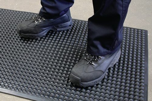 Arbeitsplatzbodenbelag Fertigmatte L1200xB900xS15mm schwarz PUR COBA aus hochwertigem Polyurethan mit genoppter Oberfläche · Brandschutz geprüft nach BS EN 13501-1 · Temperaturbeständigkeit von -40 °C bis +80 °C · Mattenstärke 15 mm · allseitig abgeschrägte Kanten · Farbe schwarz · Sondermaße auf Anfrage erhältlich