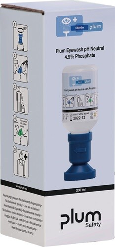 Augenspülflasche pH Neutral 200ml 3Jahre(ungeöffnete Flasche) DIN EN15154-4 Plum bei Verätzungsgefahr · sterile Phosphatpufferlösung (4,9%) im geschützten Einzelkarton · für die schnelle Neutralisierung von Säuren und Alkali · zur Nachfüllung der Augen-Notfallstation (und für den Einzeleinsatz geeignet) Weitere technische Eigenschaften: · Haltbarkeit: 3 Jahre (ungeöffnete Flasche) · Höhe ca.: 163mm · Breite ca.: 58mm · Ausführung: 4,9% Phosphatpufferlösung, im Einzelkarton · Tiefe ca.: 58mm · prüfpflichtig: ja