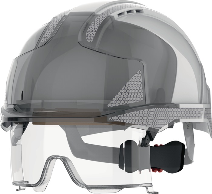 Industriehelm EVO® VISTAlens® weiß/smoke ABS EN 397,EN 50365 JSP nach EN 397, EN 50365, EN 166, EN 170 · ABS Helmschale mit Mikroschirm und Drehradverschluss · belüftet · mit integrierter optischer Schutzbrille der Klasse 1