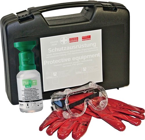 Gefahrgutkoffer 71 SN B390xH290xT95ca.mm schwarz Inhalt:· 1 Paar Chemikalien-Schutzhandschuhe aus Nitril, EN 374/388· Augenspülflasche 200 ml sterile Kochsalzlösung 0,9%, zum Ausspülen von Fremdkörpern gemäß DIN 15154-4 (4000 386 418)· Schutzbrille dichtschließend, beschlagfrei, volltransparent mit GummizugWeitere technische Eigenschaften:· prüfpflichtig: ja