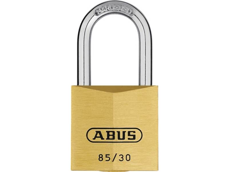 Zylindervorhangschloss 85/30HB24 Schlosskörper-B.30mm MS versch.-schl.ABUS Messingschloss, korrosionsbeständig und widerstandsfähig durch doppelte Verriegelung (ab 30 mm) sowie Bügel aus gehärtetem Stahl · Präzisions-Stiftzylinder mit Pilzkopfstiften · parazentrisches Schlüsselprofil für erhöhten Manipulationsschutz · automatisch verriegelnd: Verriegelung ohne Schlüssel durch Herunterdrücken des Bügels Weitere technische Eigenschaften: · Ergänzung: mit hohem Bügel