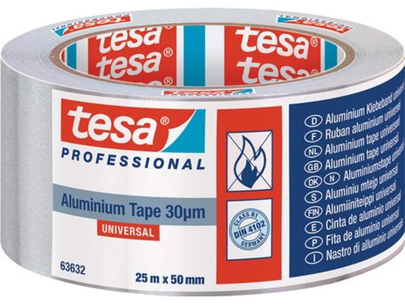 Aluminiumklebeband Univ.63632 m.Liner L.25m B.50mm Rl.TESA ür professionelle Anwendungen · eignet sich zum dauerhaften Abdichten von Isolierungen und Rohren · auch für Reparaturen von metallischen Oberflächen · Trägermaterial: Aluminiumfolie (30 ?m) · anschmiegsam, auch auf unebenen Untergründen verwendbar · beständig gegen Feuchtigkeit, Gase, Dämpfe und UV-Strahlung · elektrische und thermische Leitfähigkeit · reflektiert Wärme und Licht · flammhemmend gemäß DIN 4102 (B1) · Temperaturresistent von -40°C bis +160°C Weitere technische Eigenschaften: · Temperaturbereich: -40 bis + 160°C · Trägerart: Aluminiumfolie · Gesamtdicke: 0,065mm · Zulassung: DIN-4102: B1 · Reißfestigkeit: 25 N/cmN · Klebkraft: 8N/cm