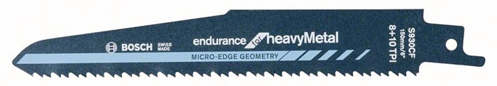 Säbelsägeblatt S 930 CF L.150mm B.22mm TPI 8+10 2,5+3,2mm 2x2 Geometrie 5er Pk. Säbelsägeblatt S 930 CF. Endurance for Heavy Metal. Werkstoff: BIM. Micro-Edge Geometry · patentierte 2x2 Tooth Geometry. Einsatzbereiche: Für starke Bleche (von 4 bis 12 mm Stärke) und für dickwandige · massive Rohre und Profile (kleiner als 100 mm Stärk