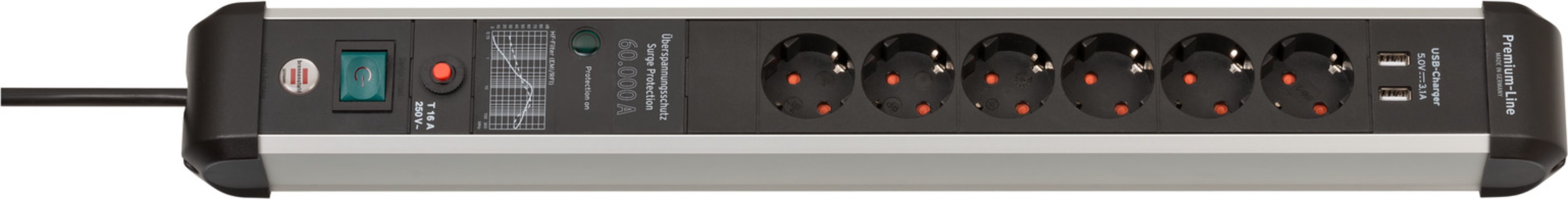 Brennenstuhl 1391010610 Premium-Protect-Line 6fach, USB 3.1A Premium-Protect-Line, Steckdosenleiste 6-fach mit USB und Überspannungsschutz (3m Kabel, mit Schalter, 2x USB max. 3100 mA, Made in Germany) Steckdosenleiste 6-fach mit hochwertigem Gehäuse aus Aluminium im schlanken Design - eignet sich ideal für die Verwendung zu Hause oder im Büro, um angeschlossene Geräte mit Strom zu versorgen Steckdosenleiste mit USB schützt wertvolle Geräte vor Überspannungen mit einem max. Ableitstrom bis zu 60.000 A (Schutz bei Gewitter, Blitzschlag, etc.) Mehrfachsteckdose mit 3 m Kabel (H05VV-F 3G1,5 ) kann durch das innovative Befestigungskonzept ganz einfach an der Wand montiert oder am Tischbein befestigt werden Überspannungsschutz Steckdosenleiste mit beleuchtetem Sicherheitsschalter zum Ein- und Ausschalten (zweipolig) - ermöglicht auf Knopfdruck das Trennen aller angeschlossenen Geräte vom Stromnetz Mehrfachsteckdosenleiste mit Überspannungsschutz können Spannungsspitzen reduzieren, sodass die angeschlossenen Geräte nicht beschädigt werden