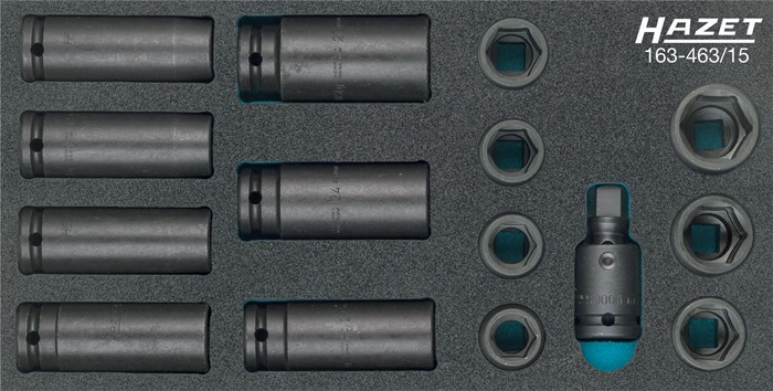 Werkzeugmodul 163-463/15 15-tlg.Anz.Werkzeuge:15 HAZET (1/3 Modul) Kraft-Steckschlüssel-Satz · Antrieb: Vierkant 12,5 mm (1/2 Zoll) Abtrieb: Außen-Sechskant-Tractionsprofil je 1 Schlag-, Maschinenschrauber Steckschlüsseleinsatz, Sechskant, kurz 17 / 18 / 19 / 21 / 22 / 24 / 27 mmSchlag-, Maschinenschrauber Steckschlüsseleinsat, Sechskant, lang 17 / 18 / 19 / 21 / 22 / 24 / 27 mmSchlag-, Maschinenschrauber Gelenkstück, Antrieb/Abtrieb Vierkant 12,5 mm (1/2?)Weitere technische Eigenschaften:· Breite: 342mm· Tiefe: 172mm