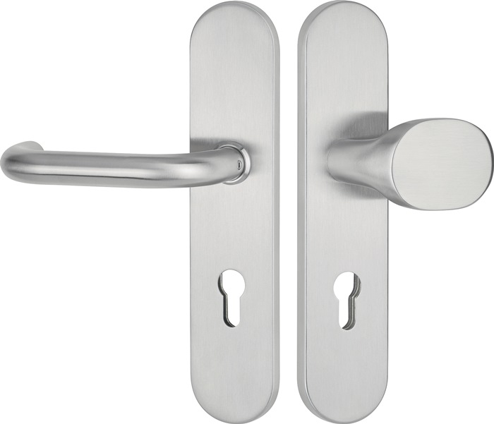 HERMAT 17640 1801/2089.S/3128/EN2.PZW Schutzgarnitur 1801/2089.S/3128 Edelstahl 72 mm 36-53 mm ZT-EN2 Wechselgarnitur mit Langschild 2089 S, Knopf 3128 gekröpft · Außenschild bestehend aus Stahl Unterkonstruktion mit gehärteter Außenplatte und Edelstahl Dekor-Abdeckschild, unsichtbar verschraubt · gehärtete Stahlnocken zur Aufnahme der Gewindeschrauben · 3-fach M6 Verschraubung mit Stahlschrauben und Gewindestopp · Knopf links / rechts verstellbar mit integrierter Verdrehsicherung · Innenschild mit Stahl-Unterkonstruktion und Edelstahl Dekor-Clipschild unsichtbar verschraubt · Drücker fest gelagert · Ausführung PZ gelocht · Aussenschild 12 mm stark