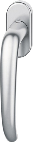 Fenstergriff 34 1023 VA f.matt 24-38mm m.Rastung FSB nach DIN EN 13126-3 · Design als Säbelform, wie von Max Bill für die Ulmer Hochschule gestaltet · 4-Punkt-Kugelrastung zur spürbaren und hörbaren Positionierung des Fenstergriffs in 90 Grad Schritten · Befestigung unsichtbar · mit stabilisierenden Stützno