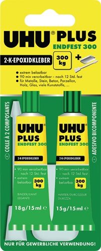 2K-Epoxidharzklebstoff PLUS ENDFEST 300 33g gelblich Tube UHU lösungsmittelfreier 2-Komponentent-Epoxidharzkleber für höchste Belastungen · die Verarbeitungszeit beträgt bis zu 90 Minuten · Härtezeit und Endfestigkeit (bis zu 30 N/mm²) sind temperaturabhängig · bei Raumtemperatur nach 12 Stunden fest · die Klebeverbindung ist schlagfest, alterungs- und feuchtigkeitsbeständig · klebt Metalle, Glas, Porzellan, Keramik, Holz, Marmor, Stein, Beton, Duroplaste, glasfaserverstärkte Kunststoffe, Hart-PVC, Gummi, Hartschaum-Kunststoffe, z.B. Styropor® Statikmischer bei der Doppelkartusche nicht im Lieferumfang enthalten, diese müssen zusätzlich bestellt werden (4000 353 423, 4000 353 424, 4000 353 425) Weitere technische Eigenschaften: · Farbe: gelblich Achtung : Der Verkauf ist aufgrund der ätzend-Klassifizierung nur noch an gewerbliche Endkunden gestattet. Das Produkt ist nicht mit einem kindersicheren Verschluss versehen, wodurch die Abgabe an den privaten Endkunden verboten ist!