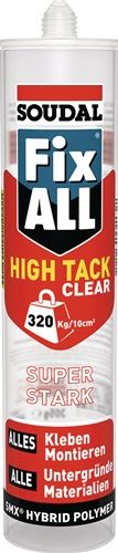 1K-Hybrid-Polymer Fix All HT transp.305g Kartusche SOUDAL flexibler Klebstoff auf Basis von Hybrid-Polymer · für Hochleistungs-Verklebungen aller Art wie z.B. Türzargen, Fensterbänken, Platten, Paneelen, Fußbodenleisten, Zierleisten, Holzkonstruktionen und Isolationsmaterialien · für dynamisch beanspruchte, strukturelle Verklebungen, bei denen eine hohe Anfangsklebekraft gefordert wird · für alle Materialtypen sowie auf allen üblichen Untergründen · hohe Anfangshaftung mit außergewöhnlicher Endklebkraft (320kg/10cm²) · universell einsetzbarer Kleb- und Dichtstoff · geeignet unter allen (Witterungs-) Bedingungen und auf allen Untergründen sowie Materialien (auch in feuchtem Zustand) · dauerhaft elastisch · direkt überstreichbar · für Innen und Außen · gleicht Unebenheiten aus · witterungs-, alterungs- und UV-beständig · lösemittelfrei · sehr emissionsarm EC1+ / für gesundes Wohnraumklima · silikonfrei Weitere technische Eigenschaften: · Aushärtungsdauer: ca. 3 mm/24 Std. · Chemische Basis: Hybrid Polymer · Verarbeitungstemperatur: +5 bis +35°C · Temperaturbeständigkeit: -40 bis +90°C