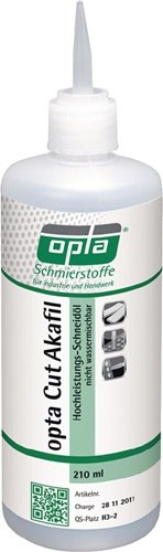 Gewindeschneidöl Cut Akafil 210 ml Flasche OPTA universell anwendbar · hochviskos · nicht wassermischbar · Mineralölbasis · mit leistungsstarken Wirkstoffen in besonders hoher Konzentration · eignet sich speziell zur Bearbeitung schwer zerspanbarer Werkstoffe, besonders beim Gewindeschneiden und Reiben · überall dort einzusetzen, wo schwierigste Bearbeitungen vorliegen und höchste Leistung gefordert wird · insbesondere für die manuelle Schmiermittelzufuhr · chlor-, silikon-, lösemittel- und PCB-frei