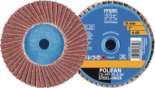 Fächerschleifscheibe COMBIDISC-Mini-POLIFAN D.50mm K.60 19100min-¹ PFERD Korund A · flache Ausführung · Werkzeug für universelle, grobe Schleifaufgaben bei hoher Abtragsleistung · ideal zum Beschleifen von Schweißnähten und schwer zugänglichen Stellen · nur mit Spannschaft verwenden