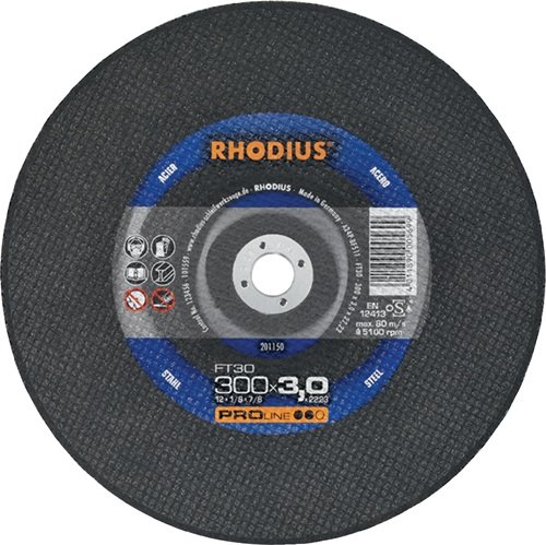 Trennscheibe FT30 D350x4mm ger.STA Bohr.25,4mm RHODIUS starke Leistung auf Benzin- und elektrischen Trennmaschinen · Material: Baustähle · Werkzeugstähle · Moniereisen · Grauguss · Duktilguss Anwendung: Rohre und Profile · SML-Rohre · Vollmaterial · Stahlbau · Flacheisen Besondere Produktvorteile: hohe Schnittgeschwindigkeit · hohe Standzeit · verstärkte Armierung für hohe seitliche Belastung Weitere technische Eigenschaften: · max. Drehzahl: 5500min-¹