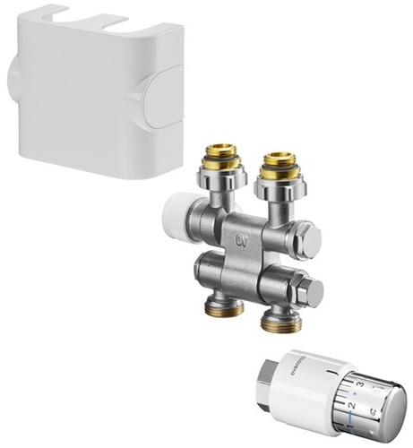 OV Badheizkörper-Anschluss-Set 7 Vorlauf-/Rücklaufanschluss weiß schwenkbar · bestehend aus: Multiblock TF Anschlussarmatur mit Voreinstellung · Ein-/Zweirohrarmatur · Design-Abdeckung · Uni SH Thermostat mit Flüssig-Fühler · SH-Cap Weitere technische Eigenschaften: · RAL-Nummer: 9016 · Regulierbar: Ja · Typ: H-Unterbl