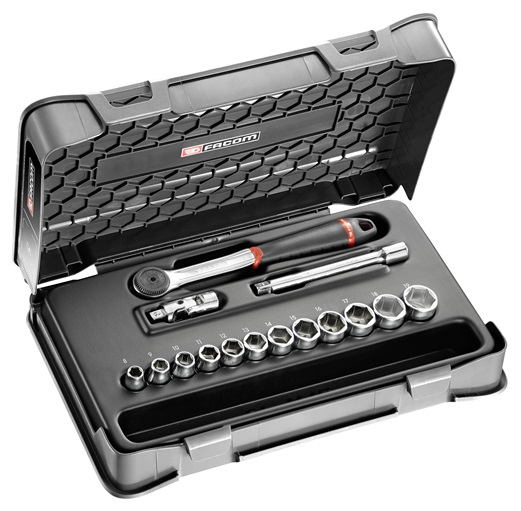 Facom J.161-1P6 Steckschluessel-Set 3/8 J.161B, 15-tlg Steckschlüsselsortiment 3/8", 6-Kant, metrisch - 15 Teile - J.161B Produktstärken: Enthält: 1 Dichte Hochleistungs-Umschaltknarre 3/8": J.161B. 12 Steckschlüssel 3/8, 6-Kant, metrisch: J.H 8 - 9 - 10 - 11 - 12 - 13 - 14 - 15 - 16 - 17 - 18 - 19 mm. 1 Verlängerung 3/8": L 125 mm (J.210). 1 Kardan 3/8": J.240A. Lieferung mit einem Piktogrammblatt zum Personalisieren Ihres Koffers. Leerer Koffer: BP.MBOXM. Warmgeformte Platte M (309 x 188 mm): PL.M13.
