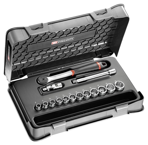 Facom J.161-1P12 Steckschluessel-Set 3/8 J.161B, 15-tlg Steckschlüsselsortiment 3/8", 12-Kant, metrisch - 15 Teile - J.161B Produktstärken: Enthält: 1 Dichte Hochleistungs-Umschaltknarre 3/8": J.161B. 12 Steckschlüssel 3/8, 12-Kant, metrisch: J. 8 - 9 - 10 - 11 - 12 - 13 - 14 - 15 - 16 - 17 - 18 - 19 mm. 1 Verlängerung 3/8": L 125 mm (J.210). 1 Kardan 3/8": J.240A. Lieferung mit einem Piktogrammblatt zum Personalisieren Ihres Koffers. Leerer Koffer: BP.MBOXM. Warmgeformte Platte M (309 x 188 mm): PL.M13.