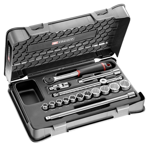 Facom J.161-2P12U Steckschluessel-Set 3/8 J.161B, 16-tlg Steckschlüsselsortiment 3/8", 12-Kant, zöllig - 16 Teile - J.161B Produktstärken: Enthält: 1 Dichte Hochleistungs-Umschaltknarre 3/8": J.161B. 11 Steckschlüssel 3/8, 12-Kant, Zollmaße: J.1/4' - 5/16' - 3/8' - 7/16' - 1/2' - 9/16' - 5/8' - 11/16' - 3/4' - 13/16' - 7/8'. 2 Verlängerungen 3/8": L 125 mm (J.210) - L250 mm (J.215). 1 Kardan 3/8": J.240A. 1 Gleitgriff 3/8": J.120A. Lieferung mit einem Piktogrammblatt zum Personalisieren Ihres Koffers. Leerer Koffer: BP.MBOXM. Warmgeformte Platte M (309 x 188 mm): PL.M18.